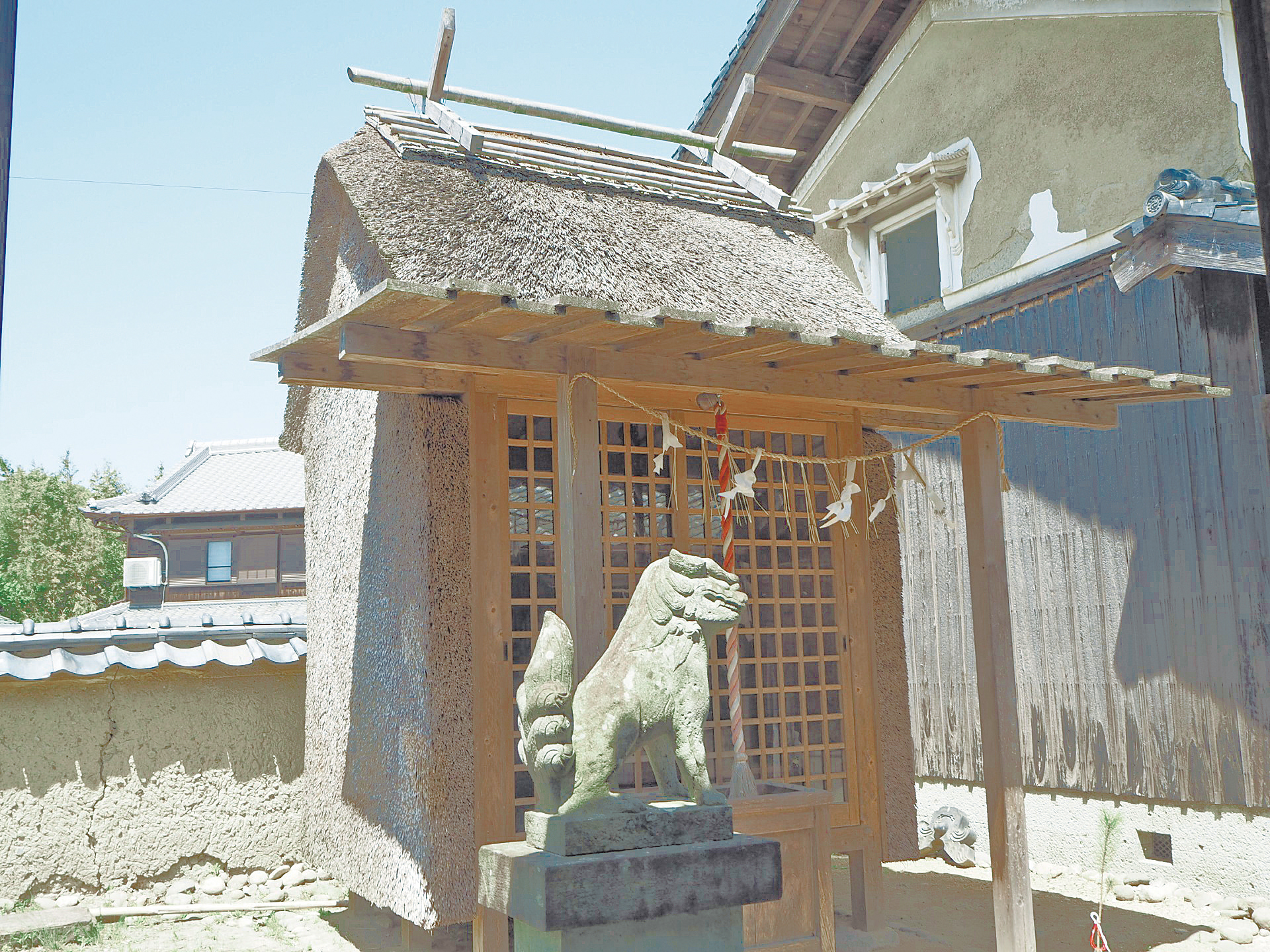 淡河本陣跡にある淡河戎神社。壁面もかやで覆われた斬新なデザインです。)