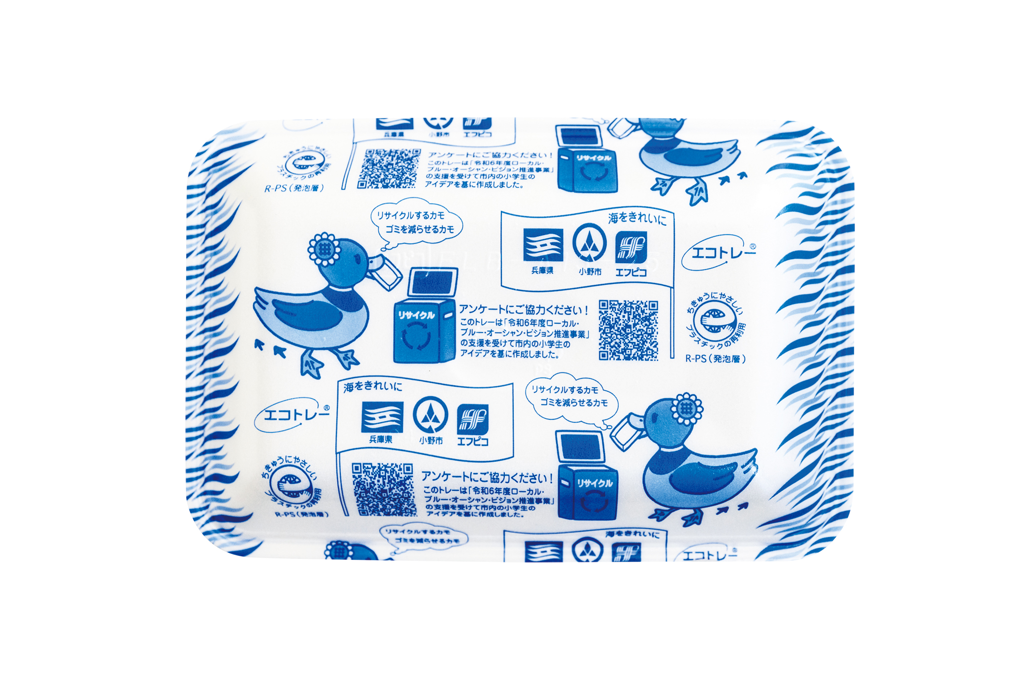県は公民連携で、使い捨てプラスチックの使用削減や資源循環を推進しています。昨秋には小野市内に食品トレー製造会社、(株)エフピコのリサイクル拠点が完成したのを機に同社、小野市と協働して、地元の小学生が描いた海ごみ問題啓発のデザインを印刷したオリジナルエコトレーを製作。11月から市内6つのスーパーで採用されています。使用済みのエコトレーは各スーパーの店頭で他の食品トレーと共に回収された後、再び新しいトレーにリサイクルされます。(県環境整備課)