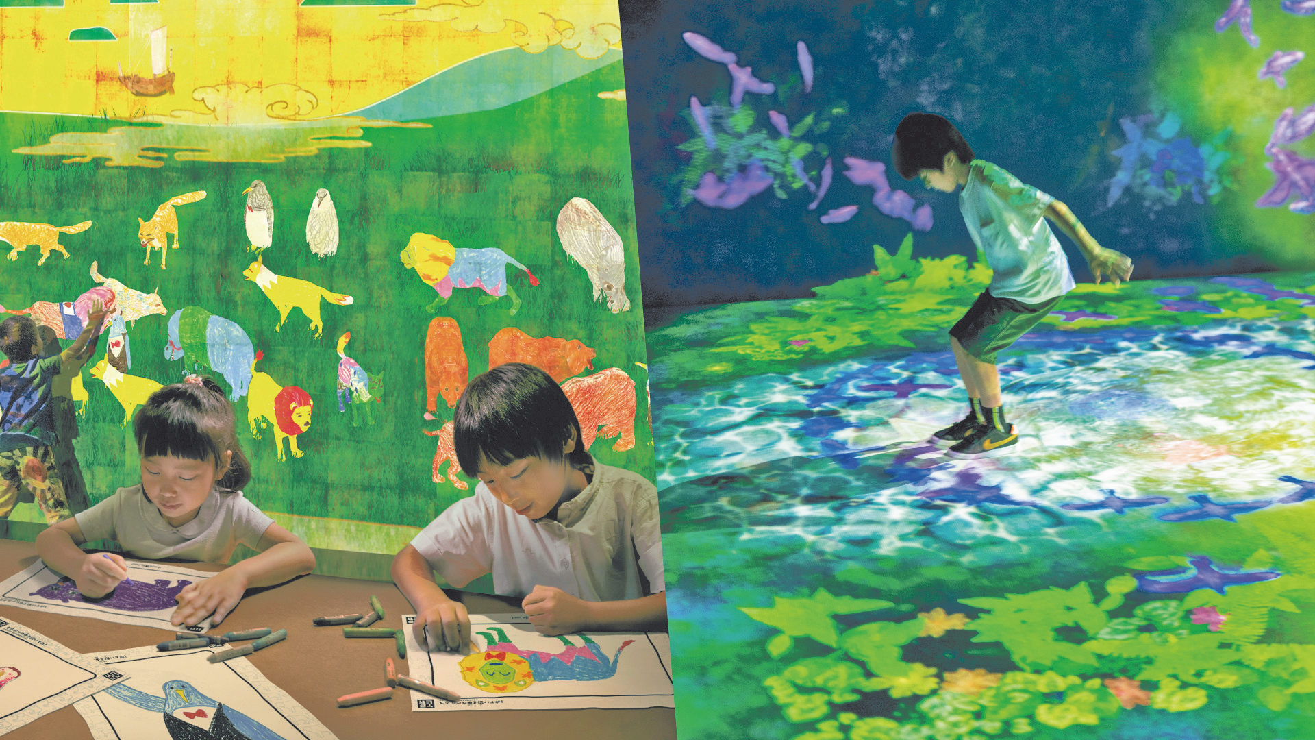 自分で描いた動物たちがデジタルアートで彩られた花と緑の空間で動き出し、「自然と生きる」没入感を体験できます。