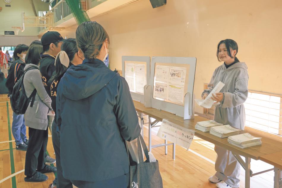 昨年11月に地域の人を招いて開催した防災訓練では、防災食レシピをアレンジした蒸しパンを2年生が発表。フレイル予防についても呼びかけました。 |