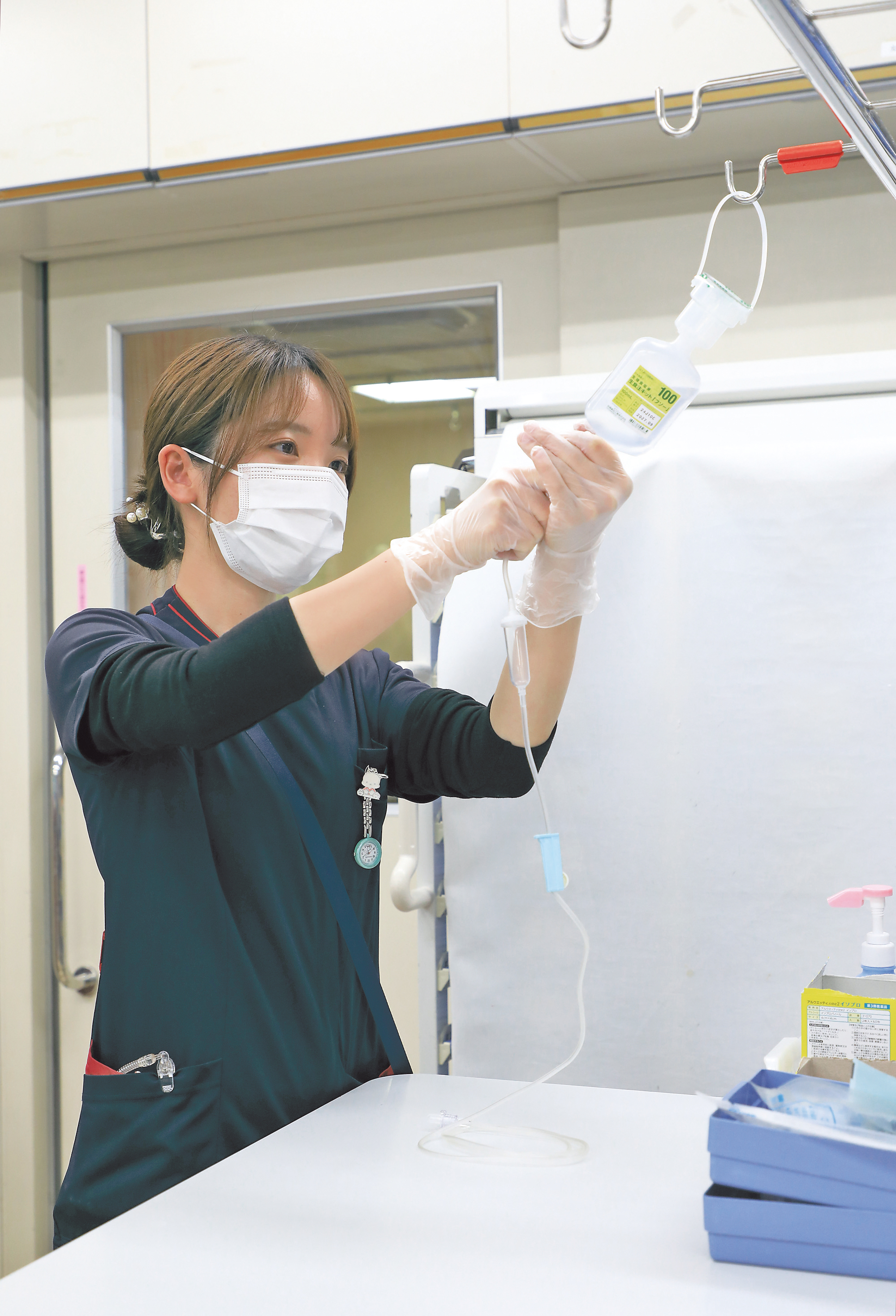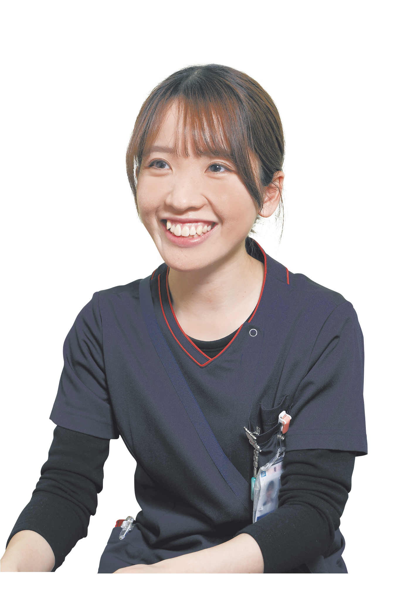 働いている人から「研修体制が整っていて、みんな温かい」と聞いたことがきっかけで入職しました。1年目は実地指導者と呼ばれる先輩がマンツーマンで指導してくださり、精神面でも支えられました。その後、実地指導者研修やリーダーシップ研修を受け、新人指導やリーダー業務を行う立場に。教えることで新たな学びもありました。業務との両立が大変な時もありますが、段階ごとの研修で基礎を固めながらステップアップでき、患者さんから「あなたで良かった」という言葉を頂くなど、やりがいと成長を感じています。