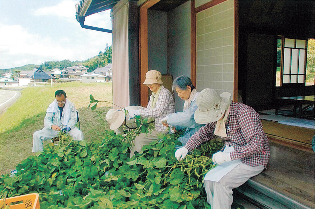 曽地中地区では40年ほど前から本格的に黒大豆を生産してきました。高齢化で農作業が負担になっていた13年前、農村ボランティア事業を知り「ふるさとむら」に登録、ボランティアの募集を始めました。毎年6月の種まきから11月の葉落としまで年15回、11軒の農家が作業をお願いしています。参加者は毎回15人ほど。神戸市在住者を中心に20代~80代と年齢層は幅広く、大阪市や京都市から来てくださる人もいます。1日5時間の作業の合間におしゃべりをしたり、冬にみそ造りなどのイベントを一緒に楽しんだり、年齢や職業の垣根を越えてさまざまな人たちと心通わせられるのも喜びの一つです。
