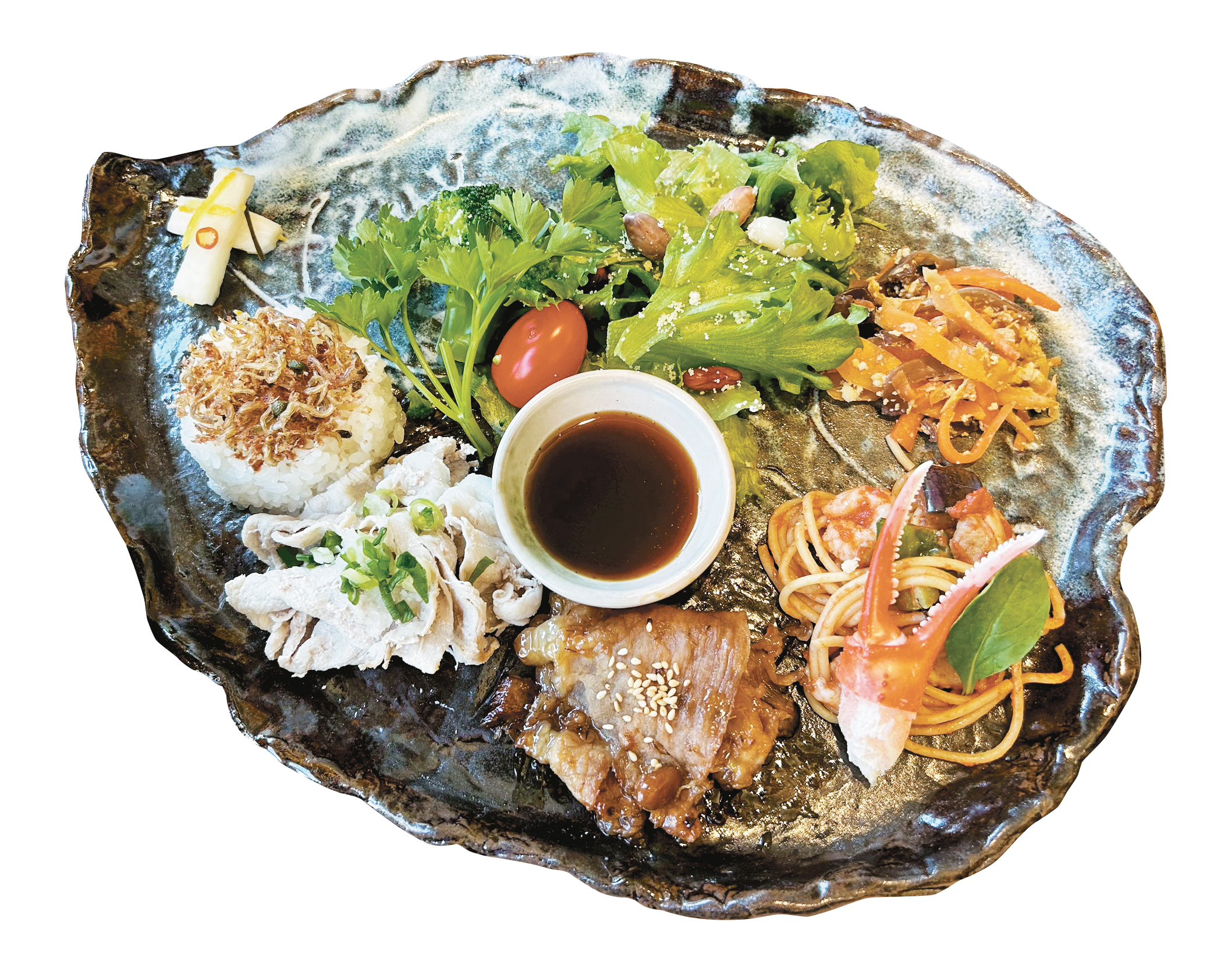 院内レストラン「凡ライス店」では、生活習慣病・内分泌代謝外来の担当医が監修した「養生ランチ」を提供中。但馬地域の食材にこだわり、低糖質で高タンパク質、良質な脂質を摂取できる料理を地元陶芸家による皿に盛り付けた、見た目も楽しめるワンプレートランチです。