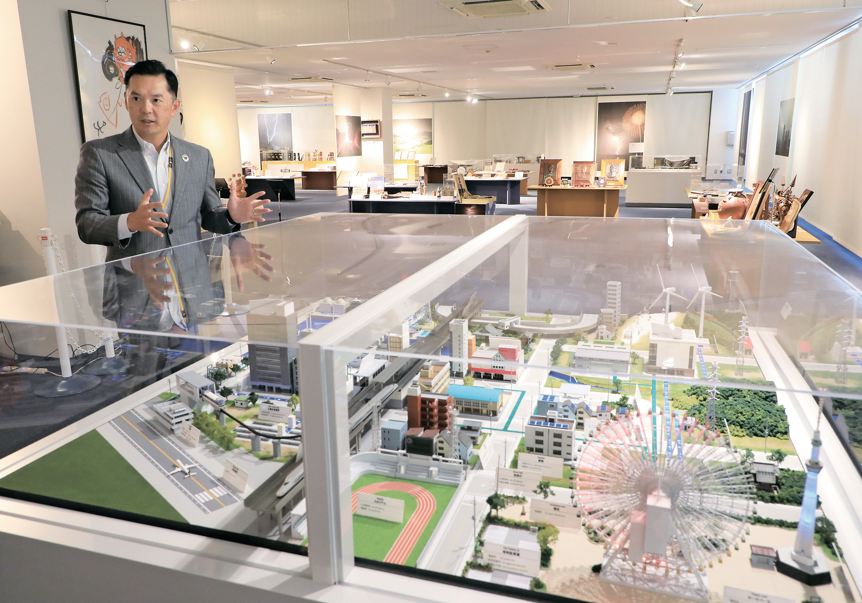 雷ミュージアムには、電柱や電車、新幹線、工場、病院、ビルをはじめ、東京スカイツリーや清水寺、風力発電所の風車など、同社の避雷器が導入されている施設の模型が。「気付かれない所で雷被害から守っています」と吉田社長。