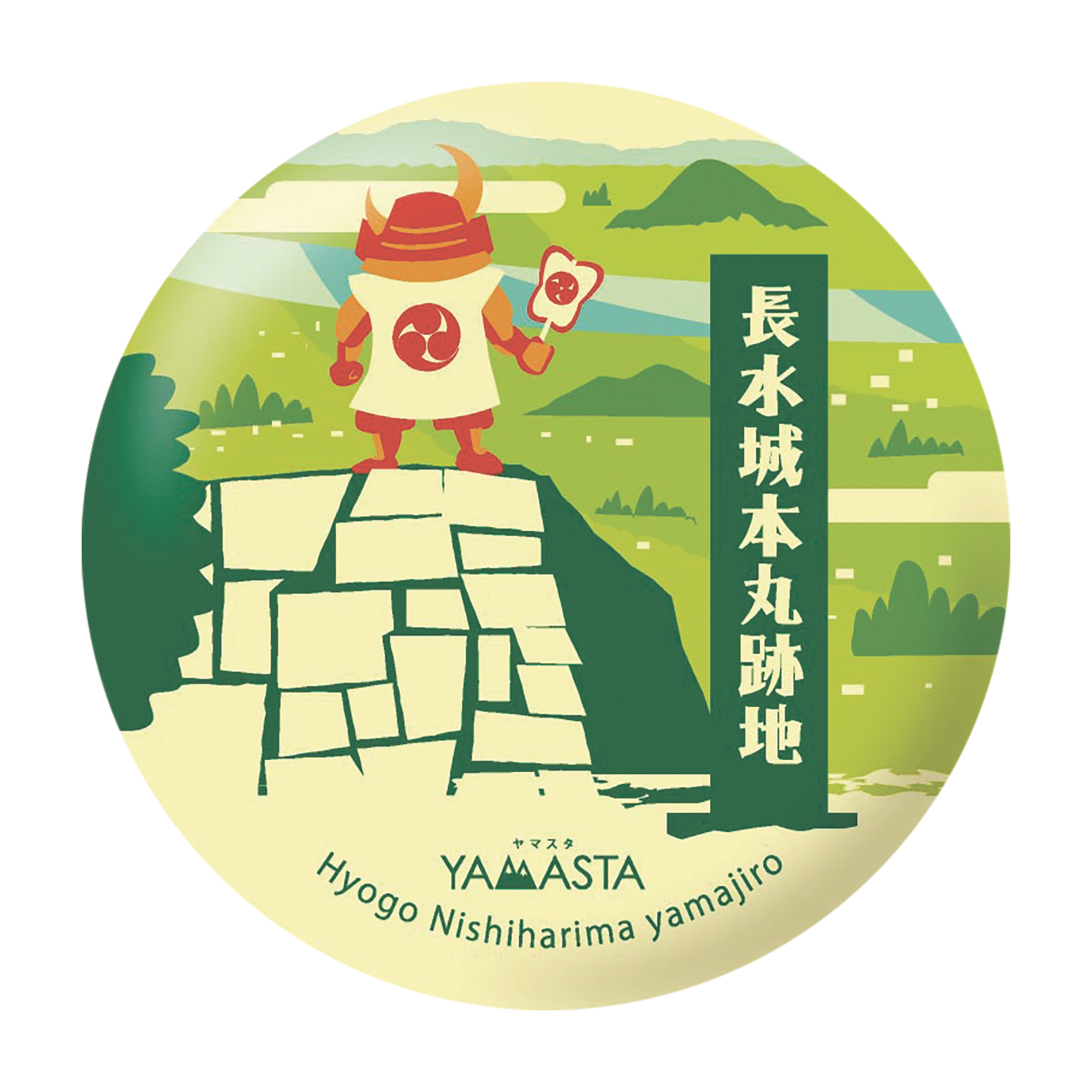 利神城のデジタルスタンプと長水城(宍粟市)の攻略記念缶バッジ。城ごとにデザインが異なり、コレクター心をくすぐります。