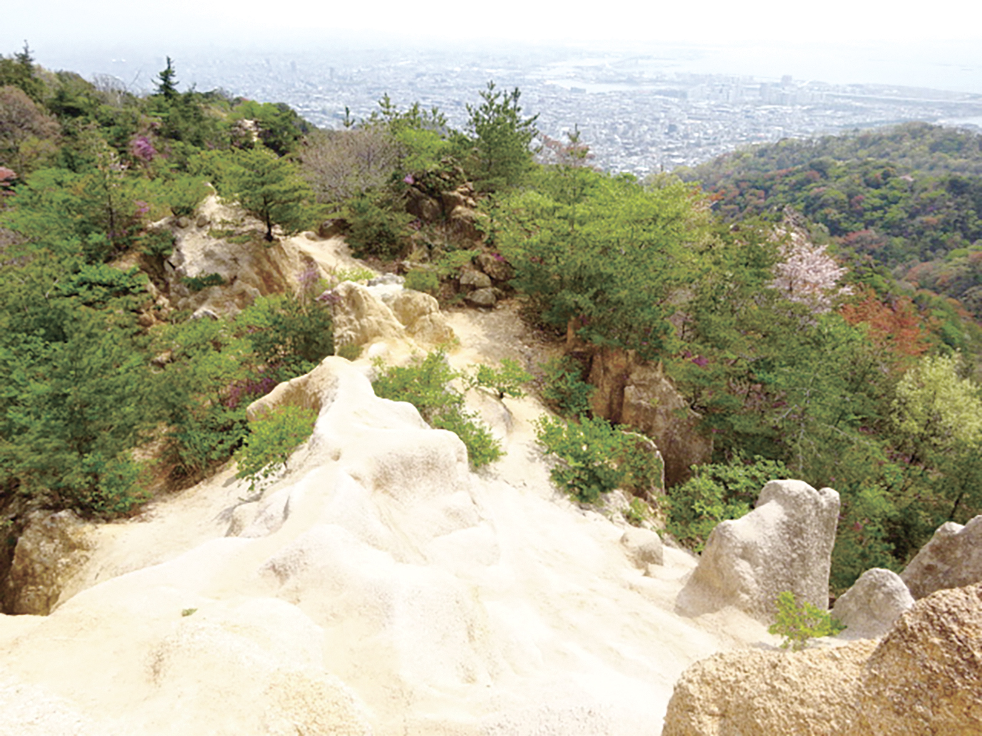 花こう岩の荒々しい岩肌、清らかな滝、阪神間の街並みや大阪湾の眺望など、短い中にも見どころが満載。子どもと一緒に楽しめるコースです。