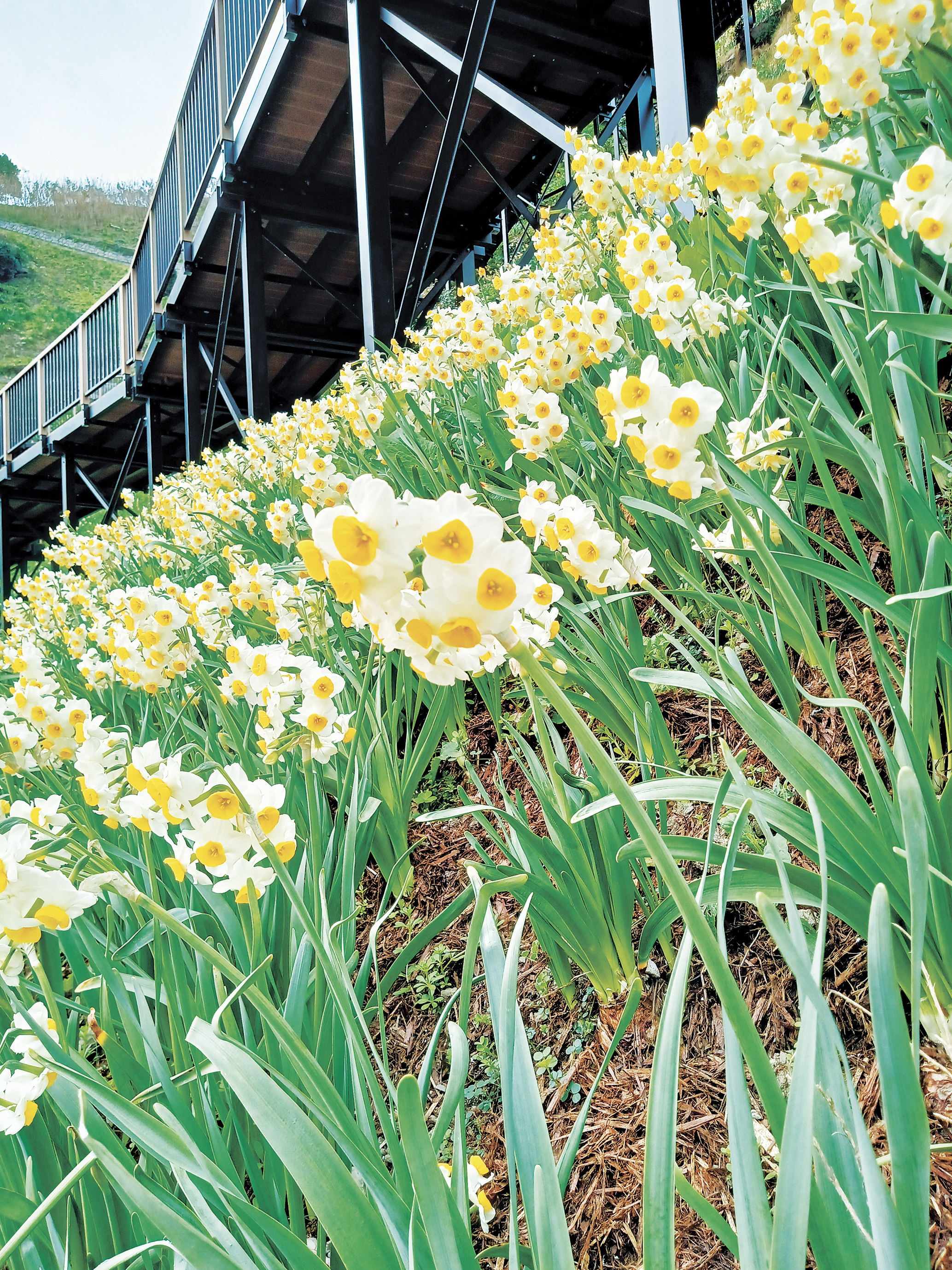 南あわじ市の諭鶴羽山(ゆづるはさん)の斜面一帯にスイセンの花が咲く「灘黒岩水仙郷」は、冬の淡路島を代表する花の名所です。江戸時代後期に、近隣の漁民が海岸に漂着した球根を植えたのが始まりといわれ、だんだんと繁殖して現在は1haに約60万本が自生しています。1月中旬から2月下旬にかけて、辺り一面に甘い香りを漂わせる白い花々が生み出す圧巻の景色は必見です。(灘黒岩水仙郷)