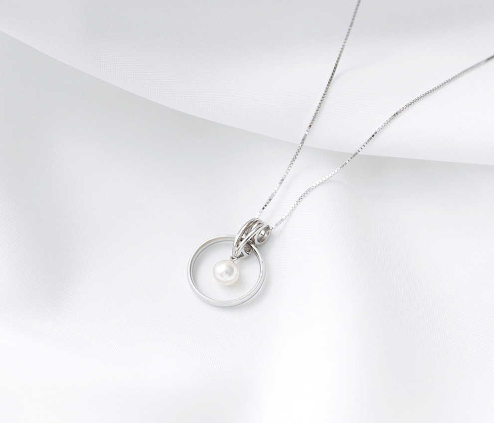 使わなくなった指輪を神戸の真珠と組み合わせてペンダントにリフォーム。シンプルなデザインで、フォーマルにもカジュアルにもマッチします。