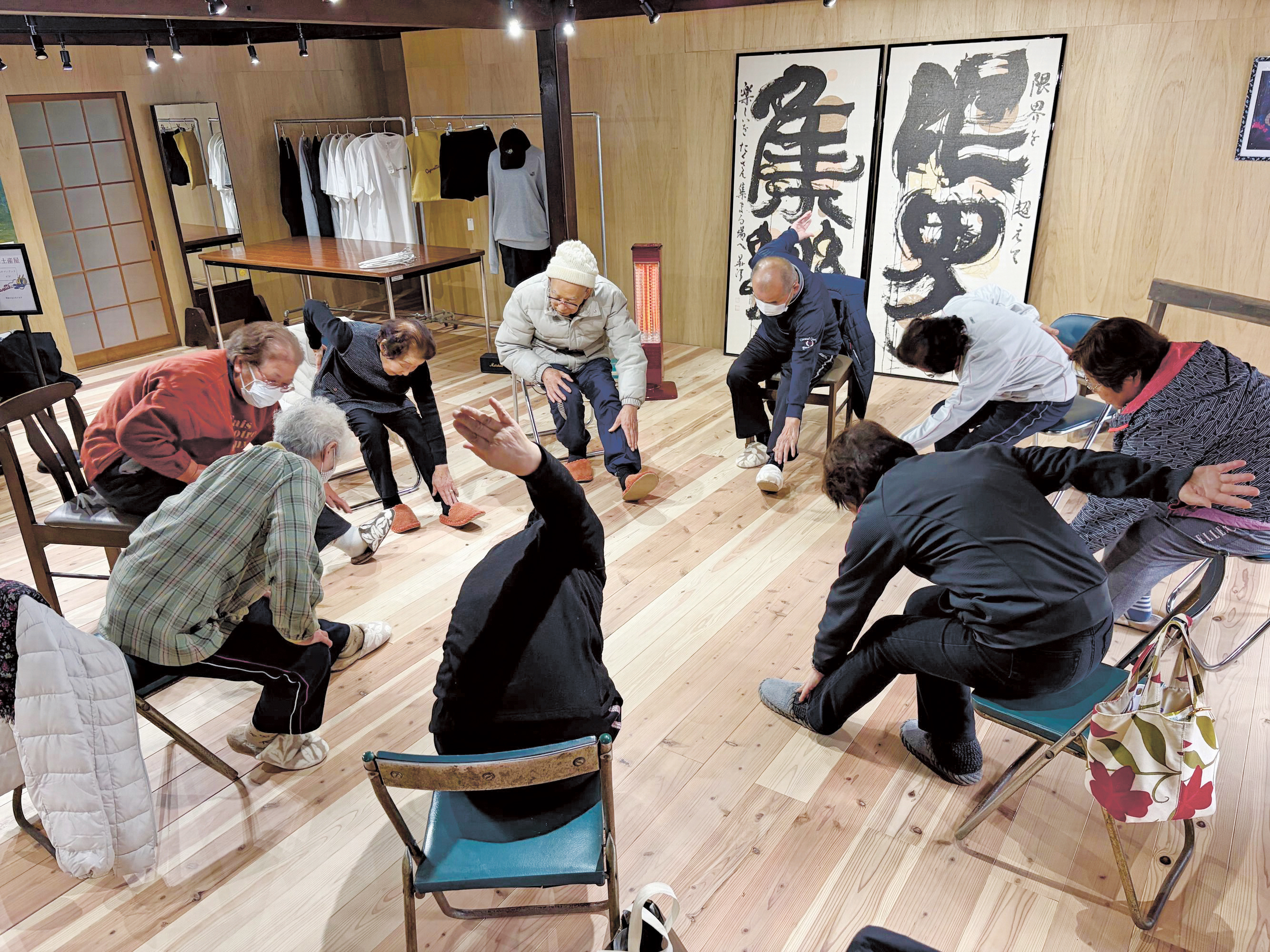“限界集楽”と書かれたふすまの前で、円になって体を動かす住民。