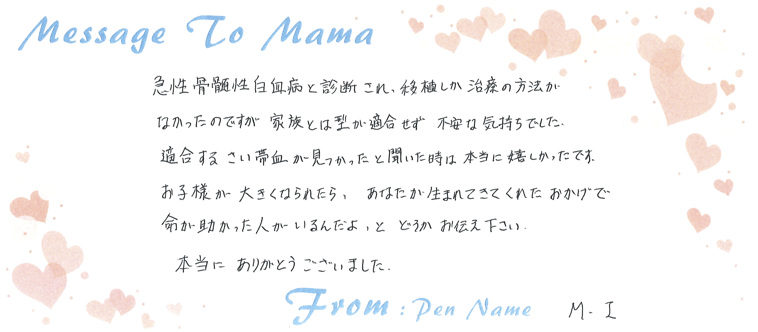 お子様が大きくなられたら、あなたが生まれてきてくれたおかげで命が助かった人がいるんだよ、とどうかお伝えください。
