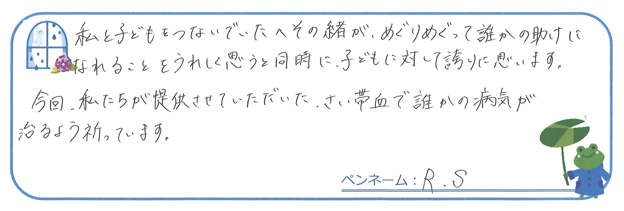 今回、私たちが提供させていただいたさい帯血で誰かの病気が治るよう祈っています。(ペンネーム R.S)