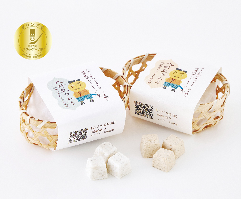 姫路市の障害福祉サービス事業所「若葉福祉作業所」が開発した、県産八升豆(ムクナ豆)を使ったラムネ。L-ドーパを含む八升豆のパワーが詰まっています。ムクナホワイトとムクナきな粉の2種があり、1袋(15個入り)600円。