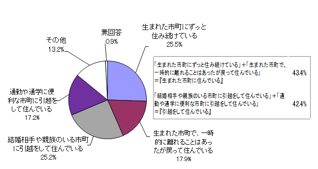 「生まれた市町にずっと住み続けている」と「生まれた市町で、一時的に離れることはあったが戻って住んでいる」を合わせた『生まれた市町に住んでいる』は、43.4%となった。「結婚相手や親族のいる市町に引越をして住んでいる」と「通勤や通学に便利な市町に引越をして住んでいる」を合わせた『引越をして住んでいる』は、42.4%となった。