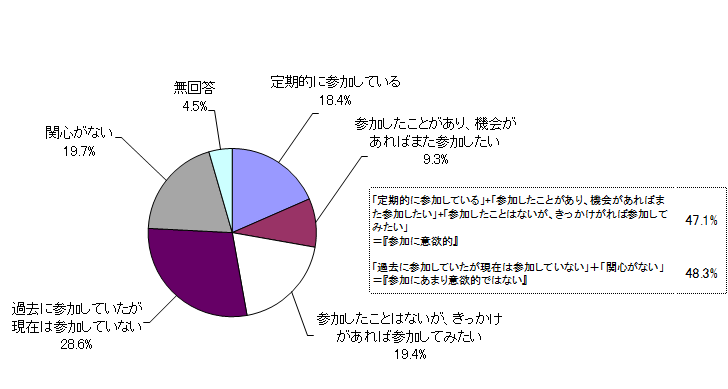「定期的に参加している」と「参加したことがあり、機会があればまた参加したい」及び「参加したことはないが、きっかけがあれば参加してみたい」を合わせた『参加に意欲的』は、47.1%となった。「過去に参加していたが現在は参加していない」と「関心がない」を合わせた『参加にあまり意欲的ではない』は48.3%となった。