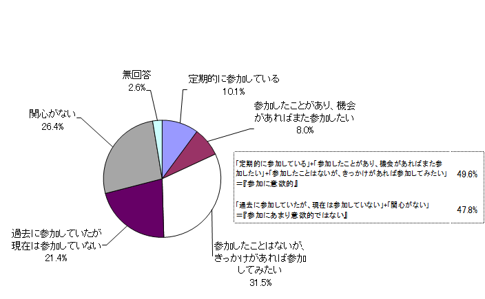 「定期的に参加している」と「参加したことがあり、機会があればまた参加したい」及び「参加したことはないが、きっかけがあれば参加してみたい」を合わせた『参加に意欲的』は、49.6%となった。「過去に参加していたが現在は参加していない」と「関心がない」を合わせた『参加にあまり意欲的ではない』は47.8%となった。