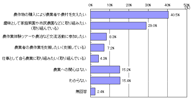 「農作物の購入により農業者や農村を支えたい(40.5%)」が最も高い。