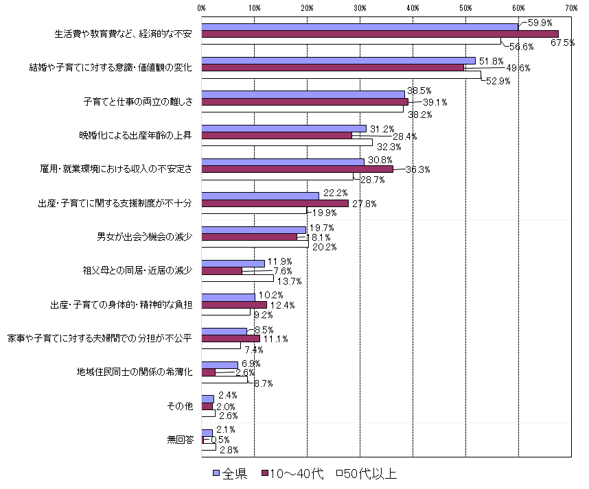 「生活費や教育費など、経済的な不安(10~40代:67.5%、50代以上:56.6%、10.9ポイント差)」や「出産・子育てに関する支援制度が不十分(10~40代:27.8%、50代以上19.9%、7.9ポイント差)」、「雇用・就業環境における収入の不安定さ(10~40代:36.3%、50代以上28.7%、7.6ポイント差)」で10~40代の子育て世代と、50歳以上の年代間で差が出ている。