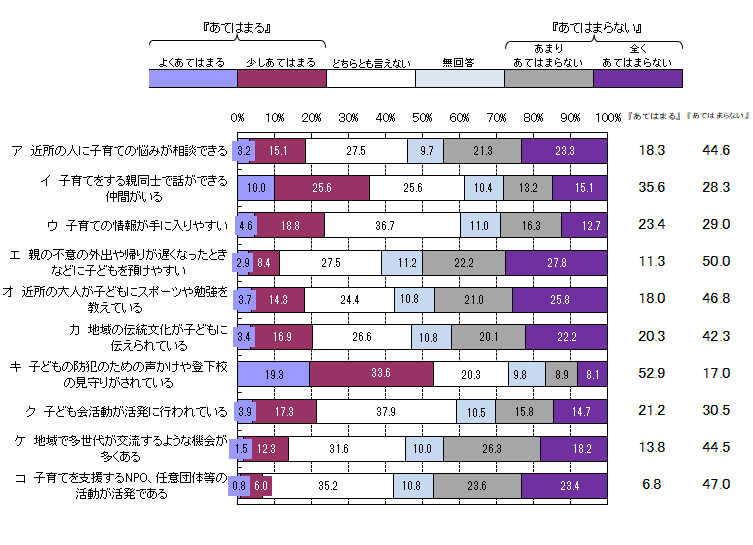 「よくあてはまる」と「少しあてはまる」を合わせた『あてはまる』は、「子どもの防犯のための声掛けや登下校の見守りがされている」が52.9%で最も高く、次いで、「子育てをする親同士で話ができる仲間がいる」が35.6%となった。