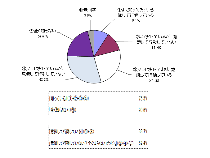 「よく知っており、意識して行動している」と「よく知っているが、意識して行動していない」と「少しは知っており、意識して行動している」及び「少しは知っているが、意識して行動していない」を合わせた『知っている』は75.5%となった。