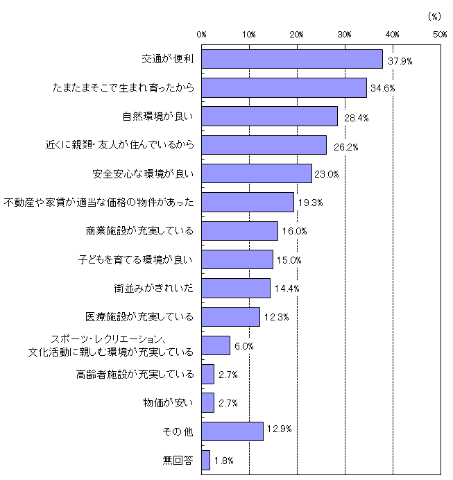 「交通が便利(37.9%)」が最も高く、「たまたまそこで生まれ育ったから(34.6%)」が続いている。