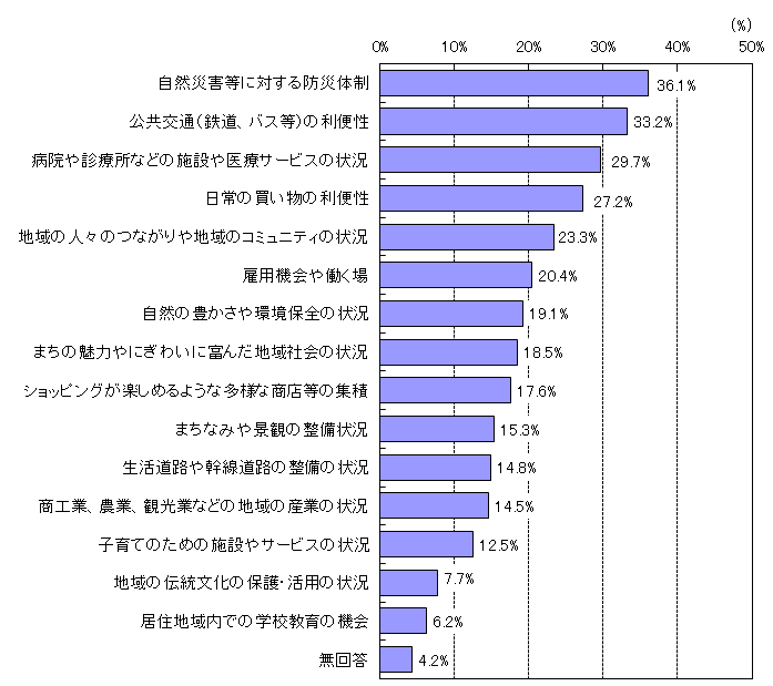 「自然災害等に対する防災体制(36.1%)」が最も高く、「公共交通(鉄道、バス等)の利便性(33.2%)」が続いている。