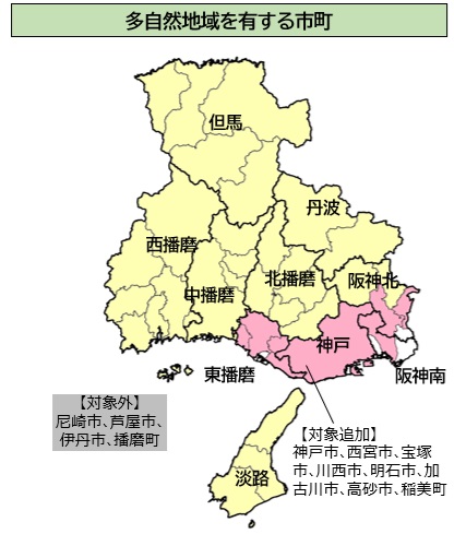 兵庫県では、地方の中小都市や中山間地域等の豊かな自然環境に恵まれた地域や大都市近郊の自然豊かな地域を「多自然地域」として定義しています。