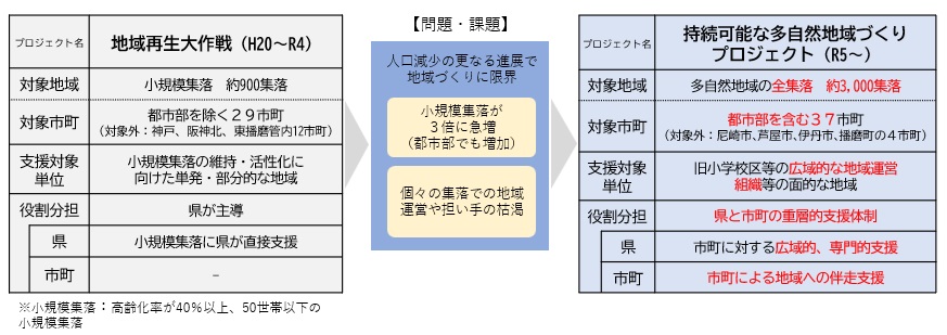 • 平成20年度から県主導で進めてきた小規模集落対策「地域再生大作戦」の成果や課題を踏まえ、令和5年度から本プロジェクトを始動しています。