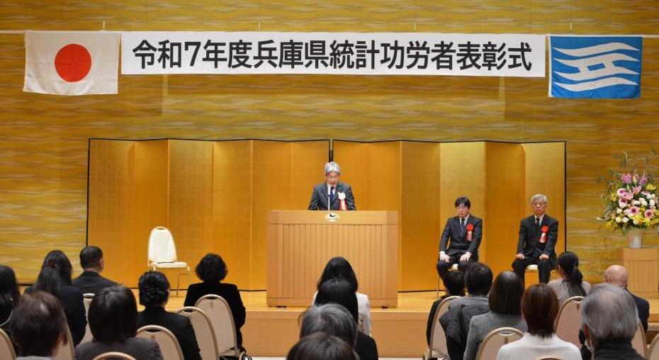 令和8年2月10日(火曜日)、ラッセホールにおいて「令和7年度兵庫県統計功労者表彰式」を開催しました。この表彰式は長年統計調査に従事され功績顕著な統計調査員、統計調査指導員の方々、統計調査の円滑な実施にご協力いただいた事業所の方々を称え表彰するもので、昭和28年から実施しています。