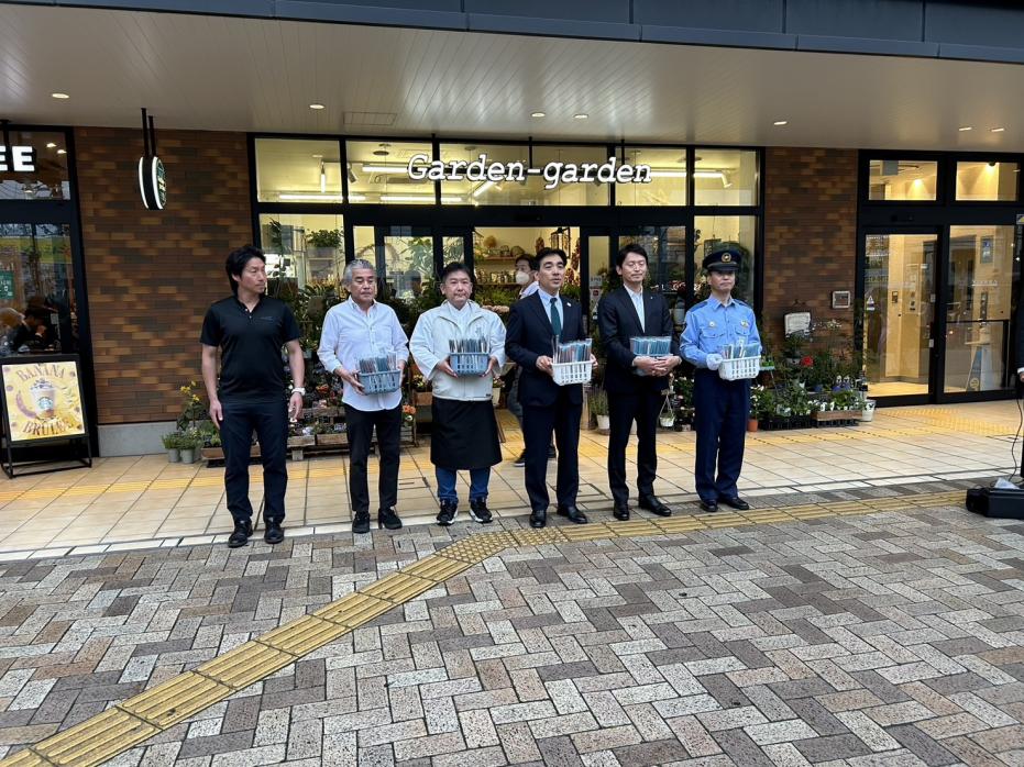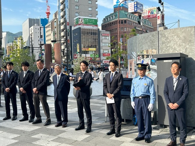 AI防犯カメラの設置に合わせて、悪質な客引きを許さない機運の醸成のため、関係者出席のもと、設置セレモニーを開催しました。