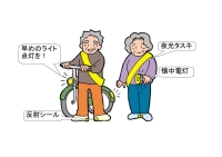 転者からも歩行者がよく見えず大変危険です。交通事故を防ぐために、明るい目立つ色の服を着て、反射材を身につけるとともに、持ち物にも取り付けるように心がけましょう。