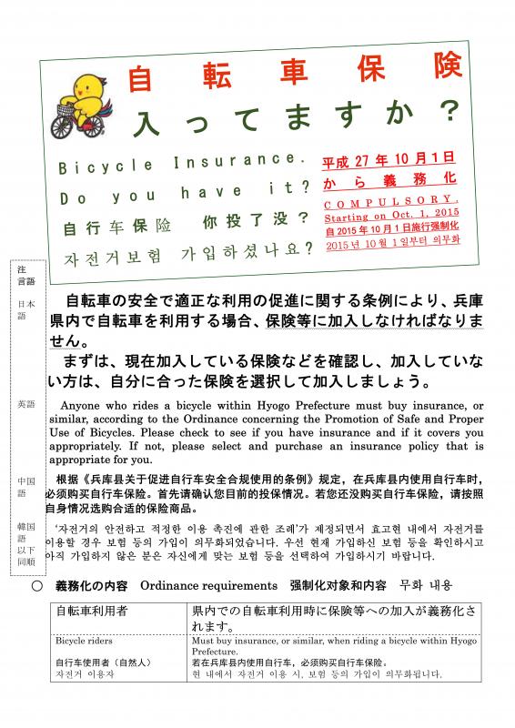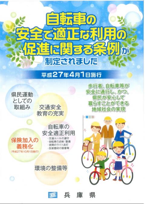 兵庫県では平成27年10月より、自転車損害賠償保険等への加入が義務づけられています!