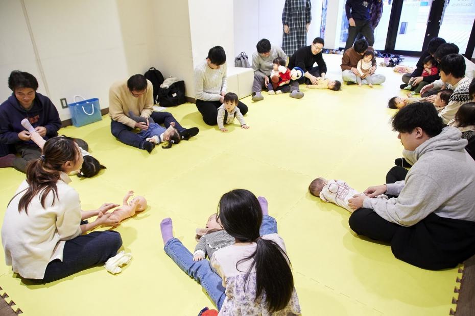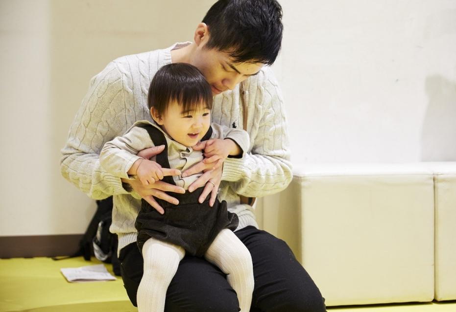 取材当日の企画は「ベビーマッサージ」。1歳6か月の大和くんの足の裏をトントン刺激したり、お腹をさすったり。他の11人のお父さんたちと体験しました。