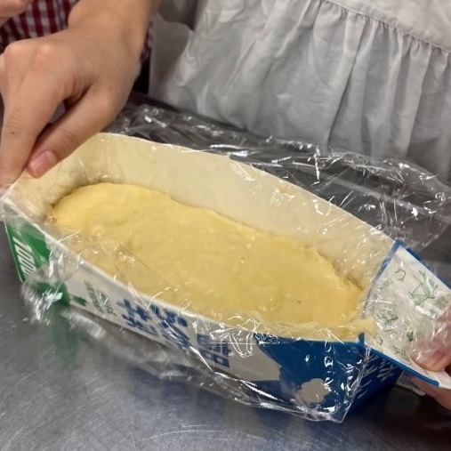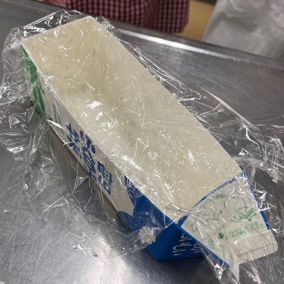 5.電子レンジより取り出した”4.”の牛乳パックのラップを持って取り出し、底面を上にして皿にのせる