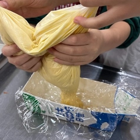 3. 牛乳パックに"2"の袋の角をつまんで、1cm程ハサミで切り、流し入れる