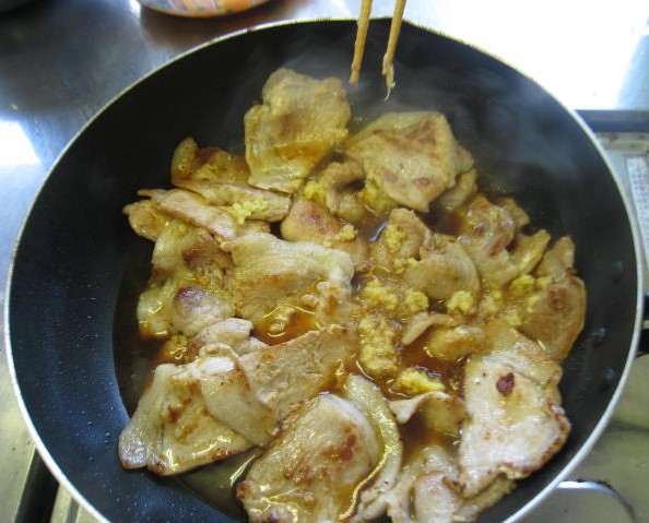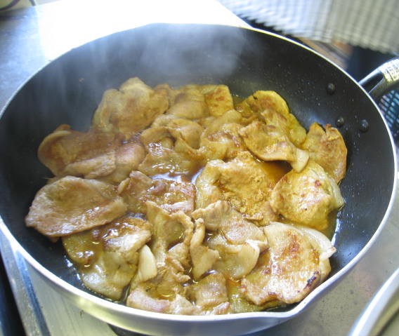 6. 火を消し、”2”の上に盛り付けて、たれをかけてできあがり!