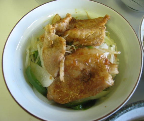 2. フライパンを強火で熱し、サラダ油をいれ、もやし、たまねぎ、ピーマンを入れてさっと炒め、塩こしょうをふって火を消す。丼にごはんを入れ、その上に炒めた野菜をのせる