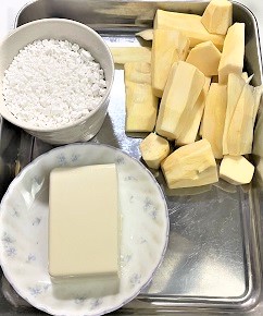 1. さつまいもは、皮をむき、大きめに切る。(切り方はお好みで:5cm程度の輪切り、太めの拍子切り等)