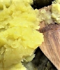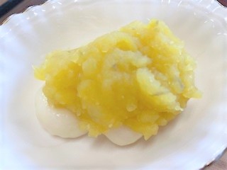 4. "3"のつぶしたさつまいもに"A"の調味料を入れ、弱火にかけ木べらで、ぼってりするくらいまで混ぜる