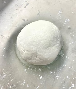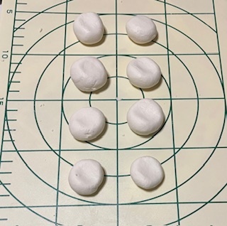 2. 1人4個になるように分けて丸め、親指と人差し指で軽く挟み、真ん中をくぼませる