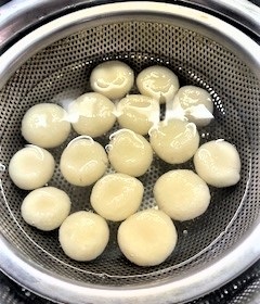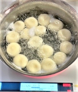 3. 大きめの鍋に湯を沸かし、”2”で丸めた白玉を入れ、すべて浮いてから、沸々沸騰させながら、2分茹でる