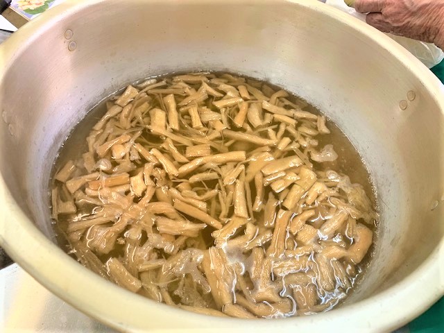 だし汁にささげ、ずいきを入れ柔らかくなるまで煮る