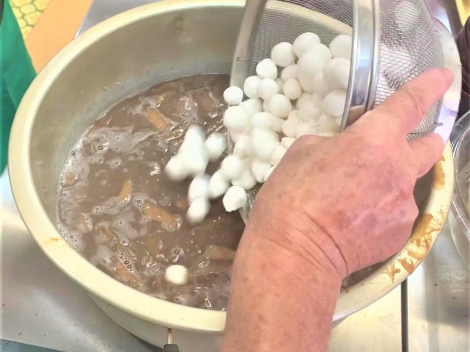 団子が浮き上がったら火を止め、器に盛り、削り節をふったら完成!