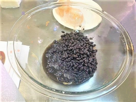 1. ささげはよく洗ってからゆでる。一度目は、ゆでこぼし、ゆで汁をすべて捨てる。2度目は指でつぶれるぐらいになるまで茹ででから水気を切っておく