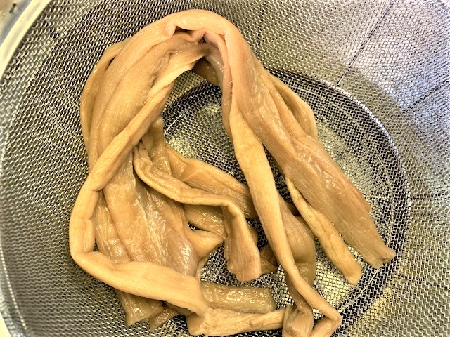 ずいきはよく洗ってから、多めの水に浸して戻す。そしてザルで水気を切っておく