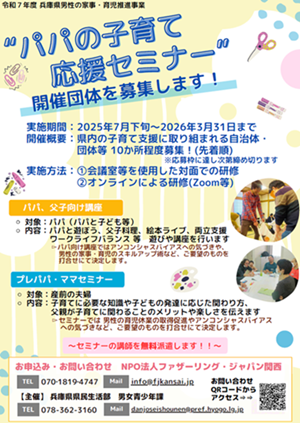 子育てをしやすい社会づくりに向けた環境を整備するため、男性が家事・育児に参画することへの理解と意識を醸成することを目的としたセミナーの開催を希望する施設・団体へ県から講師を無料で派遣しますので、ぜひお申し込みください。