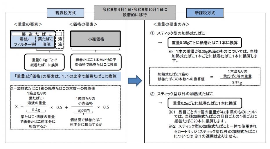加熱式たばこについては、図1のとおり、紙巻たばこの本数に換算して表1の税率を適用します。
