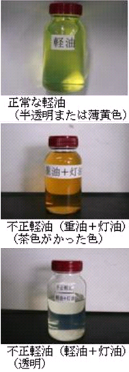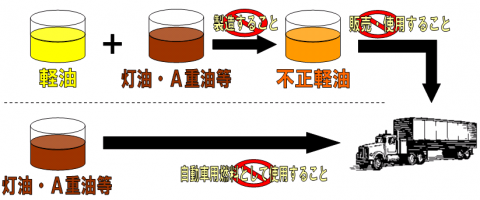 不正軽油とは、県の承認を受けずに軽油に灯油や重油等を混ぜた油などをいい、これを作ること、買うこと、使うことは違法であり、罰則の適用があります。
