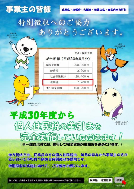 さらに平成30年度から特別徴収の一斉指定を行う兵庫県・京都府・大阪府・和歌山県及び府県内市町村では、連携して周知活動を実施しました。