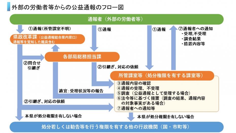 なお、処分または勧告等の権限を有する所管部局が不明な場合は、必要事項を入力のうえ、下記の入力フォームより通報してください。県政改革課が通報内容を確認のうえ、該当法令に基づく処分または勧告等の権限を有する関係部局等へ引き継ぎます。