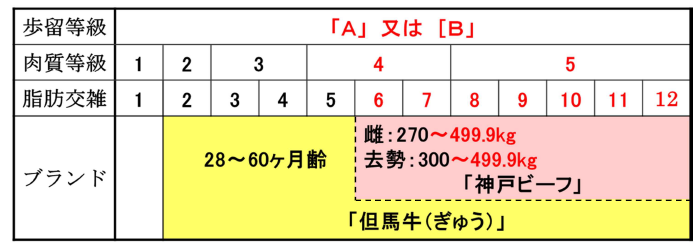 但馬牛(うし)を素牛とし、繁殖から肉牛として出荷するまで兵庫県内で飼養・管理し、県内の食肉センターに出荷した牛肉を但馬牛(ぎゅう)のうち歩留・肉質等級A・B4級以上で脂肪交雑No.6以上等の枝肉格付けのものが神戸ビーフ。